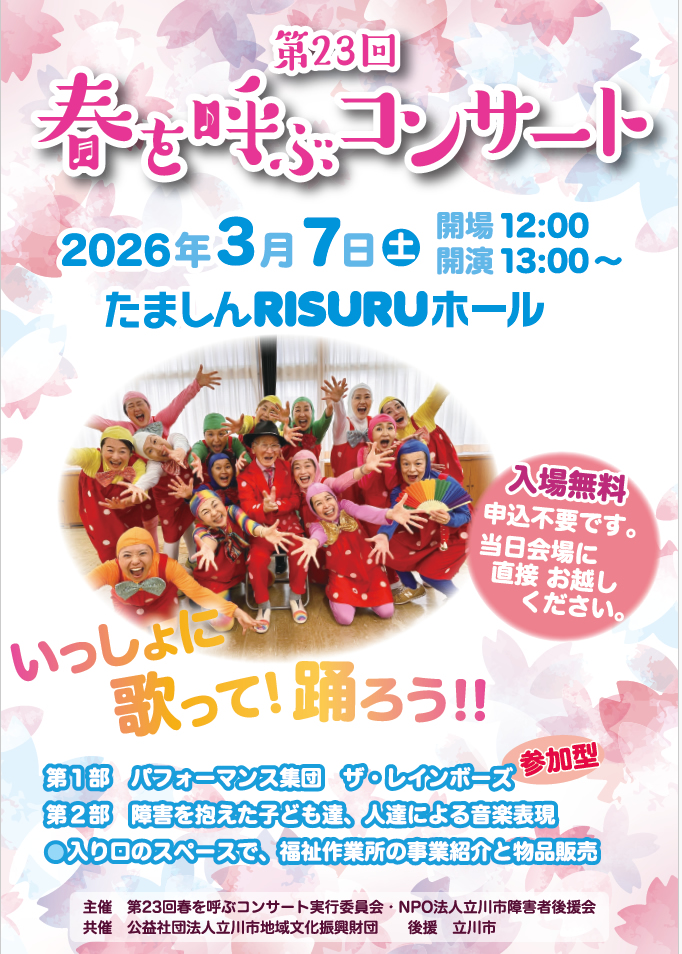 昨年から再開した「春を呼ぶコンサート」が本年からは3月に移り、2026年3月7日(土) 13:00より、たましんRISURUホールで開催します。公益社団法人立川市文化振興財団様より共催を、立川市からは後援を頂きました。
