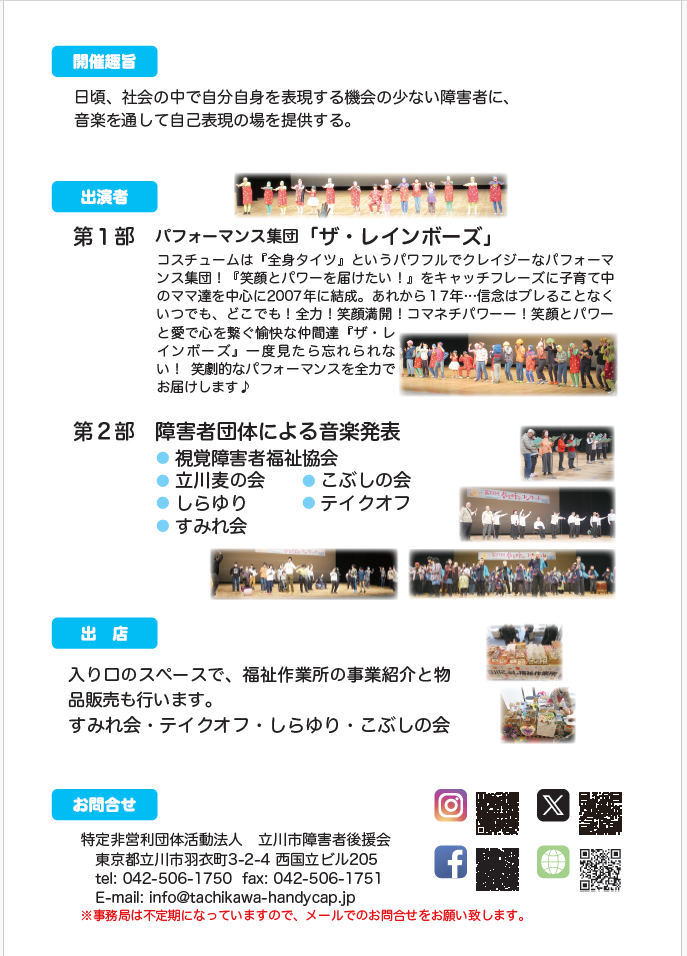 出演予定は視覚障害者福祉協会・立川麦の会・こぶしの会・ しらゆり・テイクオフ・すみれ会です。入り口のスペースでは福祉作業所の事業紹介と物品販売も行なわれます。